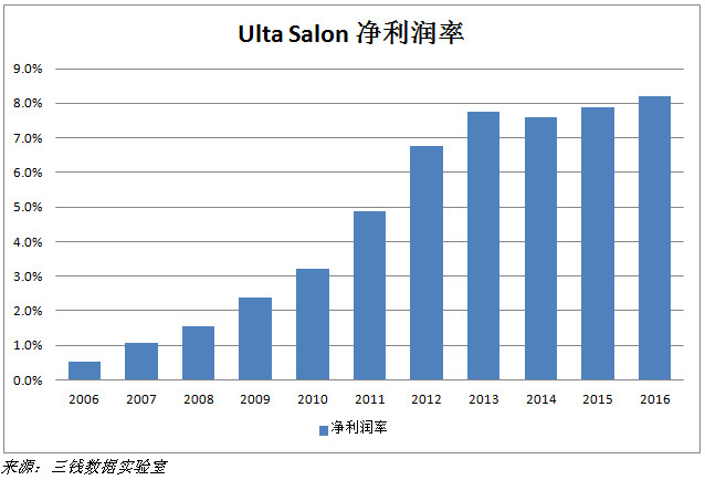Ulta Salon的门店数从2006年的近200家,增长到2016年的近900家,增长4倍多。门店的增长不仅带来的是收入的增加,同时也是与其品牌效应逐渐增强,更好的占领消费者心智,复购率不断上升,同时对供应商的话语权增强,这样有效的扩展,让Ulta Salon跨越盈亏平衡点,逐步盈利,并且净利润率逐步提高。