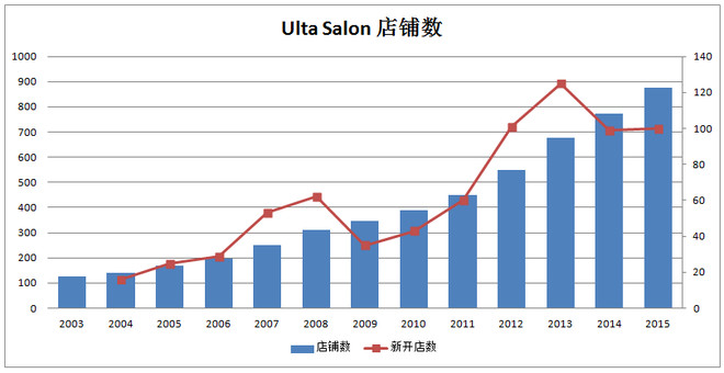 在Ulta Salon,消费者不仅可以满足平时的美容美发的需求,更可以让消费者选取超过来自500个品牌的2000款不同的化妆品。有意思的是,Ulta Salon将其售货员的业绩考核并不与其销售业绩挂钩,这是为了让售货员能够真正给消费者推荐适合的产品。 在过去的十年中,Ulta Salon良好的增长验证了其在2007年的判断,就算在2008年的经济危机中业绩仍然保持增长,而其增长的模式也很简单,便是不断开新店: