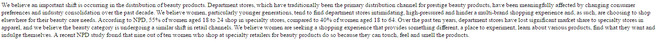 站在2007年的时间点,Ulta Salon认为,美国的美容产品的‘渠道’正在经历一个大的转变。过去,消费者喜欢去百货商店去购买化妆品,而未来的年轻人会认为百货商店很可怕(intimidating), 购物压力很大(high pressured), 并且百货商店会阻碍全品牌的一个购物体验。
