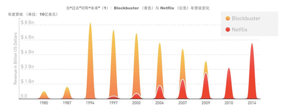 一张图可以描画代表未来的Netflix对战代表过去的Blockbuster的大场面: