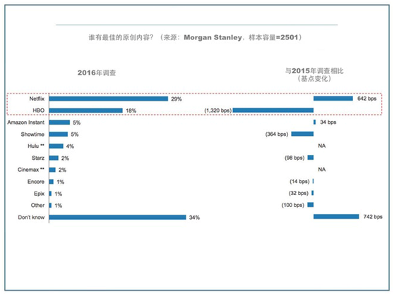 所以Netflix目前重心不是在于量而是在于质,尤其是在于内容的独家性,这是一个凿护城河的思维,让用户无法变节,因为许多内容别无分店。而目前各大机构做的问卷调查也表明Netflix的内容是有点可以护城的。比如Morgan Stanley针对18岁以上人群的代表性抽样调查(样本容量= 2501)显示,29%的受访者表示内容翘楚非Netflix莫属, 18%认为是HBO(时代华纳旗下的付费电视网),而这两位遥遥领先其他竞争对手,具体数据可以参考下图。2012年Netflix在内容上的投入大约是20亿美元,2016年预计要投入60亿美元(原创内容12亿)。