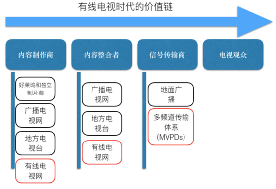 在有线电视时代,内容的整合者和内容分发者产生比较大的改变。在广播电视时代,广播电视网CBS、ABC、NBC和FOX是传统的内容整合者,他们负责从好莱坞和各大独立制片商手里购买内容,然后整合到自己的广播电视网中间,然后以无线电波的方式把电视信息输送给消费者。
