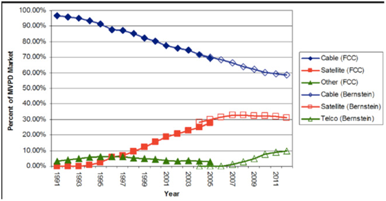 在有线电视时代,信号输送商是个典型的垄断企业。无论是卫星电视运营商还是有线电视运营商都是垄断企业。目前美国主要的有线电视运营商仅仅只有6家:Comcast,Time Warner Cable,Cox Communication, Charter,Cablevision System 和Bright House Networks。这六家加在一起占据整个有线电视行业的85%市场份额。