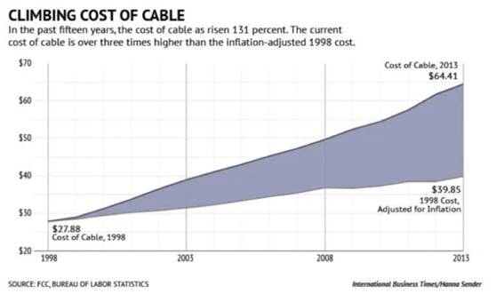 这张图是从1998年到2013年,美国有线电视费用的增长率和通货膨胀的关系。你会发现有线电视费用在2013年达到了64.41美金每月,其增速远远大于通货膨胀(灰色地带显示)。