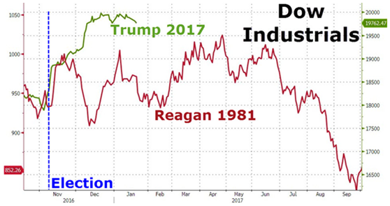 在特朗普胜选后一段时间内,道琼斯指数的走势倒是与里根时期的状况非常相似。特朗普此前提出大力投资基建并减税,受此推动,市场欢欣鼓舞。然而,如果特朗普此后无法达到市场的预期,那么又将会发生什么,仍尚未可知。