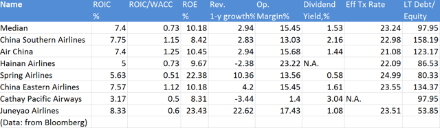 南方航空的ROIC(资本回报)高于资本成本,这意味着它能为股东创造价值。它的ROIC/WACC(资本回报/加权平均资本成本)大于1,该指标是巴菲特投资航空业时作为参考的指标。