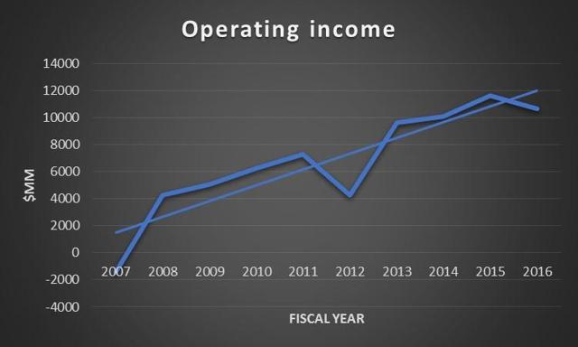 从图中可知,尽管其中某几年Visa运营开支急剧上涨,但整体而言,运营开支一直趋于平稳。这意味着公司管理层增加营收的同时,在成本控制上表现出色。在分析完营收和成本走势后,接下来营业利润成为笔者关注的重点。2007年visa的营收利润约为-14.5亿美元。而2016年财年,公司的营收利润增至106.5亿美元。