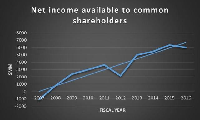 Visa的整体表现都不错,那股东的收益又如何呢?企业盈利并不一定会(至少不会直接)带来股东收益,股东收益多少视乎管理层的决议和政策。下图列出过去十年间Visa普通股东所得的净收益,观察下图可看出,只有2007年公司在亏损10.7亿美元的情况下收益为负,之后所得净收益的增幅跟上文营运利润的涨势一致。到2016财年,Visa股东获得了近60亿美元的净利润。