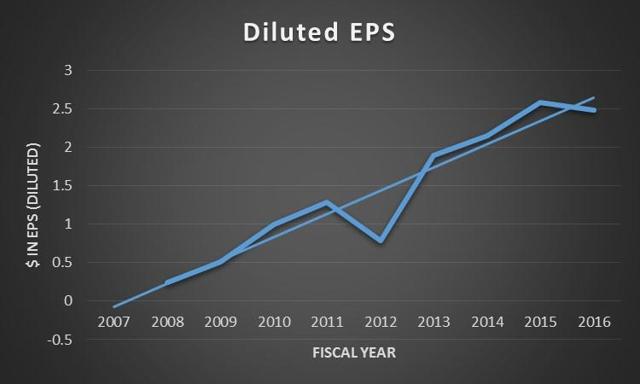 每股收益也呈现相似涨势,从2007年的0.24美元增至2017年的摊簿每股收益2.48美元(2006年收益为负,并未计算)。这意味着9年间Visa的每股收益年复增长率为29.63%,增速相当稳健。Visa的股东应感到幸运,因为公司派发的股息相当诱人。同时,这说明9年间公司的已发行股份数量大幅减少,从2007年的55.72亿股减少到2016年的24.14亿股。