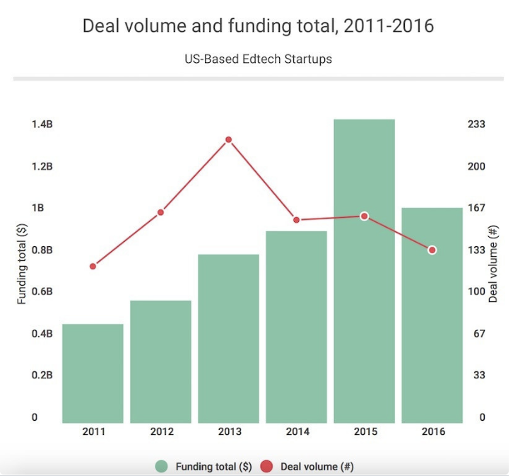 据国外教育科技媒体Edsurge发布的年度统计,2016 年,美国教育初创公司一共发生了 138 笔融资,融资金额大约在 10 亿美元;2015 年,这个数据是 14.5 亿美元,投资交易 198 起,而 Snapchat F 轮融资金额是 18 亿美元(教育领域总融资额只占这个数字的 57%)。