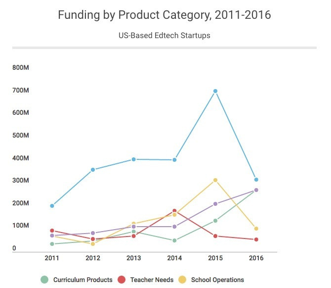 从上面这张图可以看到,从 2010 年起,美国教育科技的融资总额都呈上扬状态,从 2011 年的 4 亿美金涨到 2015 年的 14.5 亿,即便在 2016 年有所回落,但还是比早先几年高了很多。