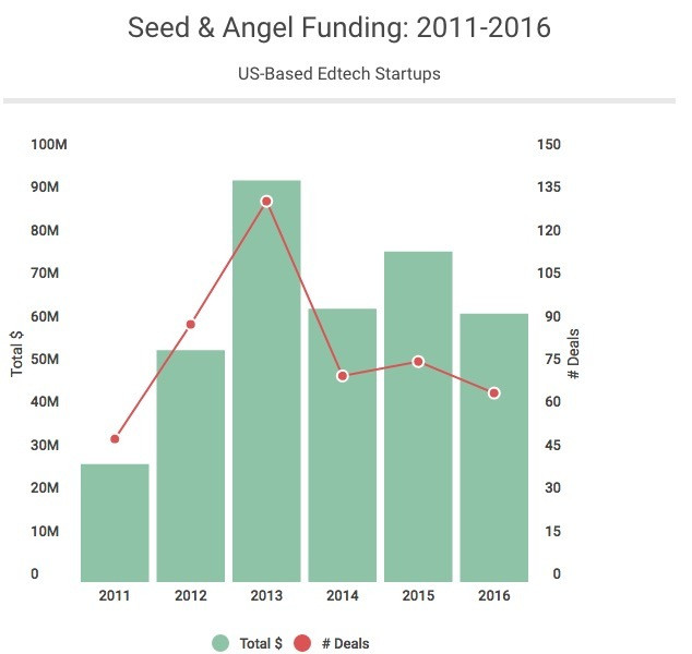 2016 年,美国教育科技界的天使轮、种子轮融资数量也在减少(仅有66 起),已跌至 2011 年来最低,但融资总额为 6250 万美元,基本与 2014 年持平。