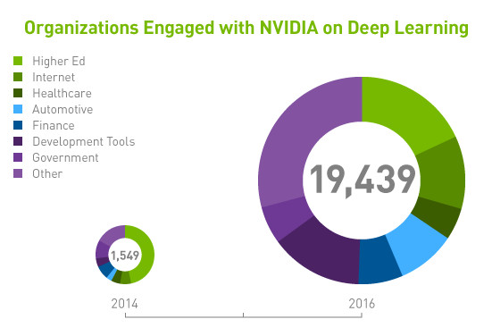 据英伟达官网数据显示,2016年, 将英伟达产品用于深度学习的机构接近两万家,相当于2014年的13倍。医疗、生命科学、教育、能源、金融、汽车、制造业以及娱乐业等诸多行业均将得益于海量数据的分析。