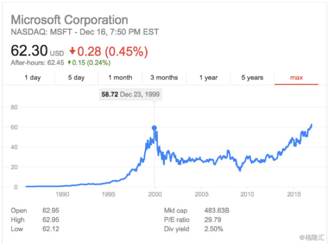 1999年互联网泡沫时,微软的股价最高到了59美金左右,对应的当时的PE是70倍,当年每股利润是0.86美金左右。