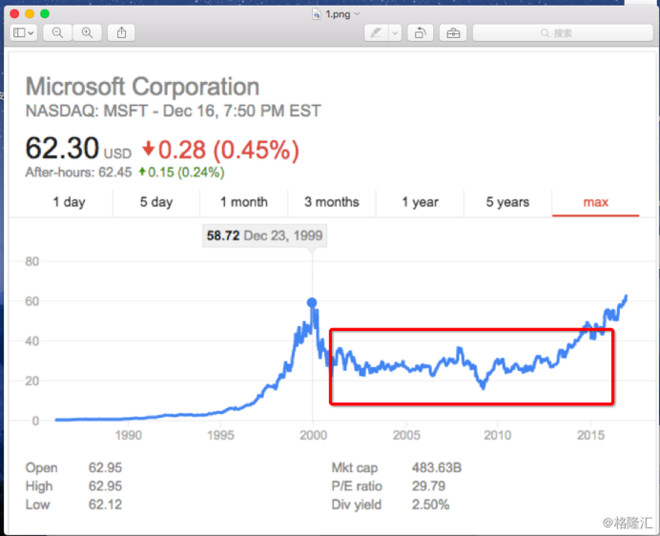 微软从2000年之后,股价一直维持在20-30美金,直到它找到了新的业务引擎—云计算。