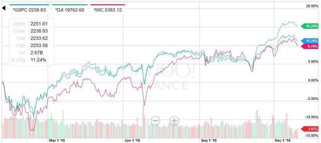 2016年全年,标准普尔500指数上涨11.24%,道琼斯工业平均指数上涨15.24%,纳斯达克指数上涨9.79%。