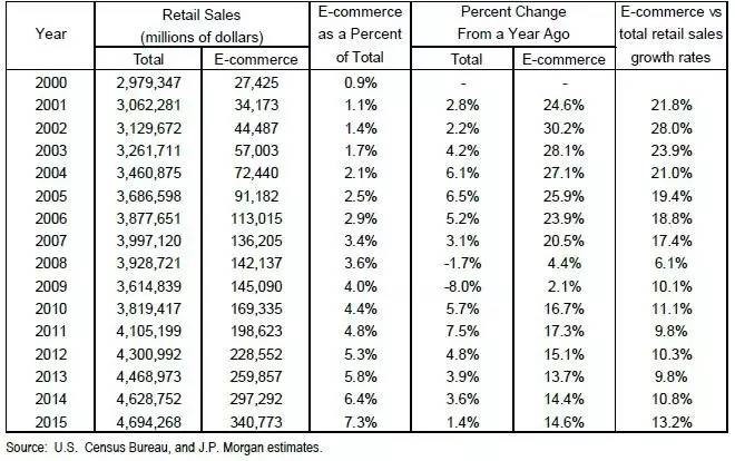 美国的互联网来的没有中国智能手机来的迅猛,一方面是因为中国有各种生产商淘宝给了很好的平台,另一方面实体店也没有退货服务,运输费用又便宜,经常江浙沪包邮。所以现在美国的零售商感受到的痛苦感觉也没有中国那么激烈,但是网购确实是在不断的扩大。大家来看下图,到2015年底,基本上网购占到14.6%。