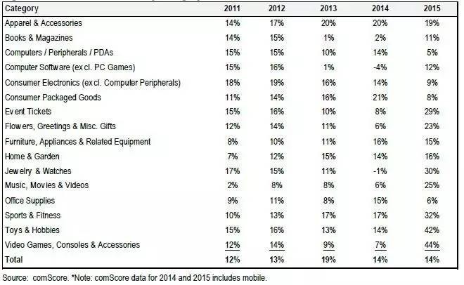 而从年增长速度来看,也是服饰类的增长最快最稳定