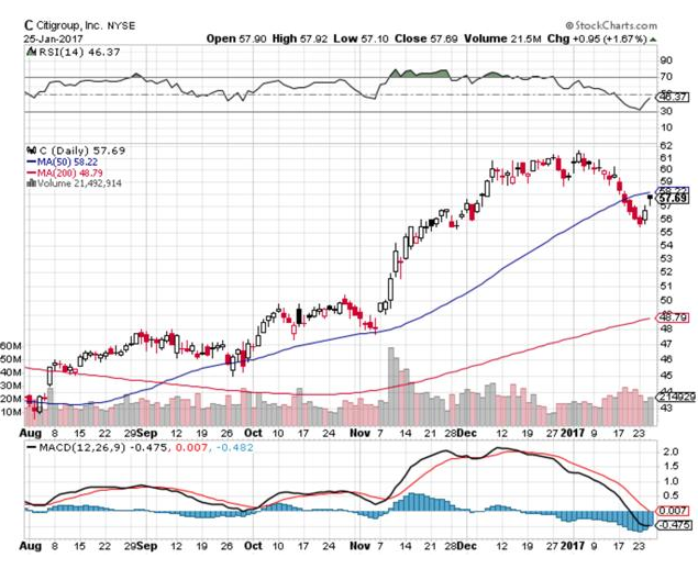 对笔者而言,能导致最大亏损的条件是特朗普真的放松金融管制。特朗普是目前任何人都无法预测的变数,因此笔者认为62.5美元是花旗的股价底线。但从技术分析角度来看,当前有一些影响股价变动的因素值得考虑。从下图顶部的相对强弱指标可知,花旗当前股价距60美元还差2.31美元。该指标是从12月23日的超卖状态反弹,而超卖是看涨信号。此外,MACD(指数平滑移动曲线)表中的蓝线位于低位,而且还在变短,这也是一个看涨信号。如果图中黑线与红线相交,那就是一个超级看涨信号!