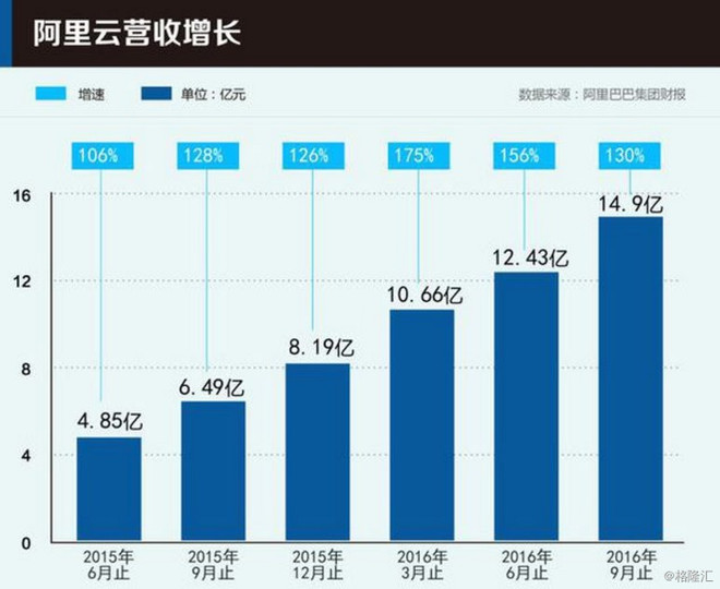 2017财年第三季度,集团收入同比增长54%,达532.48亿元人民币;核心电商业务收入同比增长45%,非电商业务增速比电商更凶猛,成为电商增收放缓之后阿里又一增长引擎。阿里云增速更是达到了惊人的130%,连续六季度领跑全球,是阿里集团增速最快的业务。