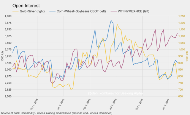 其次,据多个市场针对流动性的动态分析结果显示,流入石油市场的流动性一直保持稳定。2016年中期以来 ,针对石油市场的未平仓合约上涨25%,同时,针对贵金属及农业商品市场的未平仓合约下跌约25%。