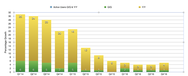 从上表可以看出,Twitter的活跃用户数量几乎停滞不前。2016年第四季度,其月平均用户数量为3.19亿,同比仅上涨4%。