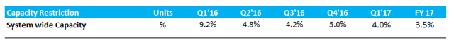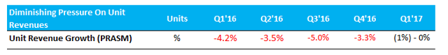 2016整年,航空业承受高压,各航空公司国际航班(拉丁美洲航线除外)的单位收入持续下降。从上图可看出,西南航空不断下调可载客量增长预期,同时单位收入将不断回升。