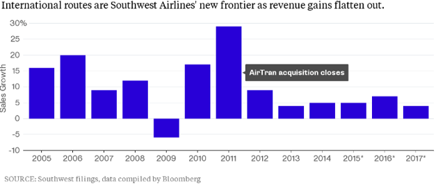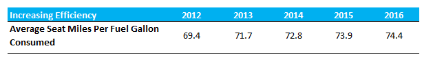 之前多年,相比其他航空公司,西南航空在可载客量上增长最快。2016年第一季度公司可载客量同比增长9.2%。然而,随着单位收入(即每个乘客飞行一公里航空公司获取的收入)下降,公司也同其他传统航空公司一样限制了可载客量的增速。因此,2016年第二季度及第三季度,公司的平均每座里程增长4%至5%。可载客量增速放缓遏制了单位收入的下滑幅度,公司2016年第四季度的可载客量同比增长4%,使得该季度单位收入的跌幅低于全年单位收入跌幅。面对未来,公司决定继续执行该策略,保持可载客量的平缓增长,从而使单位收入获得提升。