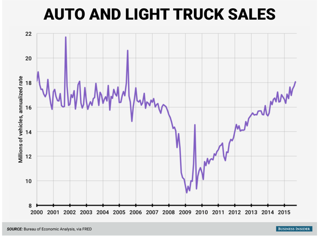 2009年至2014年期间汽车的低销量为这一争论增添了佐证,意味着汽车销量还有很大上升空间。美国车辆的平均使用年限不断创下新高,目前这一数据为11.6年。