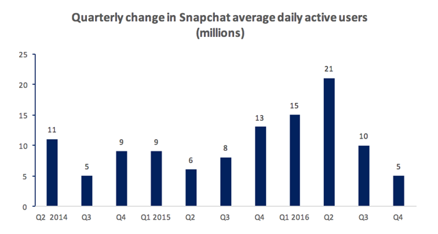 尽管Snapchat自成立以来,用户数量一直保持飞速增长,但是目前增长放缓势头初现,其日活跃用户增长速度已连续两个季度下跌。2016年第三季度,Snapchat的日活跃用户由65%降至62%;第四季度更是跌至48%。此处不妨拿另一科技巨头脸谱(NASDAQ:FB)与之对比。2016年,脸谱用户数量上涨1.89亿人次,而Snapchat的用户数量仅上涨5100万人次。值得一提的是,脸谱的良好表现主要受北美及欧洲之外的市场的提振。但即使Snapchat把墨西哥和加勒比海市场的日活跃用户数量纳入计算范围,脸谱在北美市场的表现依然优于Snapchat。从Snapchat非常规的市场地理划分可以看出,Snapchat正试图在IPO之前粉饰其北美业绩。