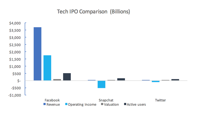 从上图可以看出,相比脸谱,Snapchat的业绩表现更类似Twitter。在此三个社交网络巨头中,Snapchat的主营利润最糟糕,损失5.2亿美元。同时,它的估值比Twitter高50亿美元。综合分析,笔者认为Snapchat的估值应在150美元至180亿美元的范围。