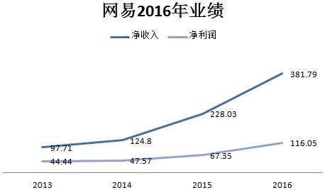 周三,网易发布了公司第四季度财报数据,显示公司2016年第四季度净收入120.99亿元,同比增长53.1%;净利润为36.83亿元,同比增长70.2%;全年净收入达381.79亿元,同比增长67.4%;净利润达116.05亿元,同比增幅达72.3%,二者均超预期,创历史新高。