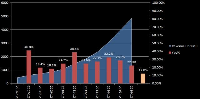 从安德玛的第四季度盈利数据来看,其EPS为0.23美元,低于预期的0.25美元,与此同时,营收相比预期下降1亿美元,尽管其表现相比预期只是稍微有所下降,但是由于营收增速放缓及悲观情绪在投资者中蔓延,市场对它的期望大幅下降。2016年第四季度,安德玛的营收仅同比上涨12%,远低于2015年的30.7%。与此同时,全年营收上涨22%,如果不参考其历史数据,这个涨幅看起来是非常惊人的。下图为安德玛的历史增长数据: