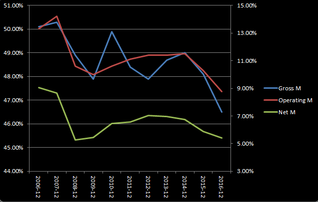 从上图可以看出,安德玛的营收增速自2014年开始呈放缓趋势,当前的增速创下了自2009年以来的新低。尽管增速创下新低,但是其管理层还进一步将2017年的增长预期下调至12%。