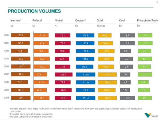 铁矿石价格下跌对淡水河谷的盈利状况造成了严重的影响。其管理层认识到他们必须得削减成本,以帮助公司在艰难的环境下生存下来。他们为了达到此目标做了诸多努力,其中之一就是关闭部分铁矿石生产设备。2016年的前三个季度,淡水河谷同比削减了20亿美元左右的成本及费用。在最近一个季度,淡水河谷的EBITDA利润率由去年同期的28.8%上涨至当前的41.3%。同时,淡水河谷的铁矿石单位现金成本也由前一季度的13.2美元/吨降至当前的13美元/吨。若铁矿石项目S11D正式启动并开始运作,预计铁矿石的单位现金成本将会进一步降至10美元/吨。