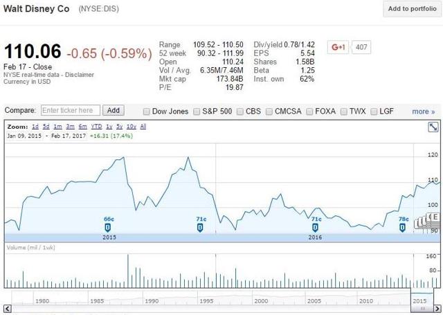1)迪士尼2016年全年股价萎靡不振,而今年年初开始上扬。