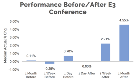 众所周知,游戏公司的财务受到产品发行的影响,具有较强的周期性。同时也受到重大展会的影响,比如,游戏界令人熟知的E3展会。而这些都将会直接放映在二级市场。如下图,动视暴雪(ATVI)其股价会在E3展会发布后1个月里面有将近5%的波动。类似的互动娱乐其作品GTA5的发行,直接贡献了公司2016年第一季度54.5%的净收入。