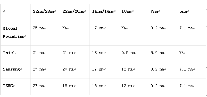 IC Knowledge去年发布了一份研究报告,通过输入四家公司处理器的CPHP和CPHP预期值计算得出未来四至五年各家厂商的实际制程。结果如下表所示: