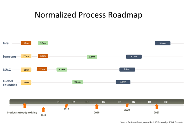 近期,随着竞争对手在较短时间内缩小了处理器制程(生产工艺),市场便开始质疑芯片巨头英特尔(NASDAQ:INTC)是否能在处理器生产工艺上保持长期以来的龙头地位。针对这些质疑,看涨英特尔的投资者和技术迷们辩解称台积电(TSMC)(NYSE:TM)、三星(OTC:SSNLF)及Global Foundries等芯片公司存在过度宣传,所产芯片的实际制程与公布的数据还有很大出入,但这些消息并不足以说明英特尔在芯片工艺上仍具有优势。就此,笔者经过调研后发现,对比四家公司的标准制程(非各厂商宣称的制程)生产计划,未来两年内英特尔将在处理器制程上会被其他厂商赶超。下文将展开详细分析。