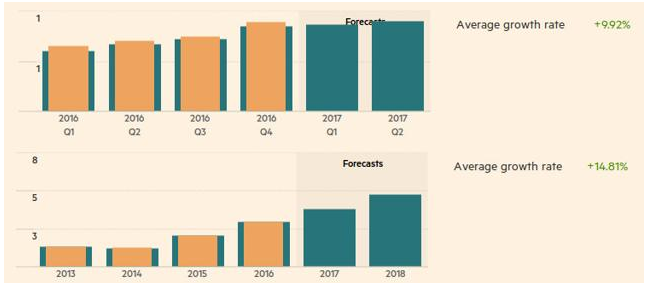 Adobe的主要财务数据表现相当出色。远期市盈率为38.73,动态市盈率为51.57,这意味着市场认为Adobe仍有上行空间。公司营收和净利润上涨,负债与总资产比率降低7%,现金流和储备增加,对内投资也在增加。在过去三个月中,Adobe收购了TubeMogul(NASDAQ:TUBE)。据预期,TubeMogul将对提升Adobe云营销服务能力大有裨益,成功收购TubeMogul后,从评级机构Zacks的数据可知,Adobe将其下一季度营收预期从16.25亿美元上调至16.44亿美元。预计云营销业务的营收将大增20%至24%。Adobe 2017年全年营收预期也从先前的69.5亿美元上调至70.9亿美元。