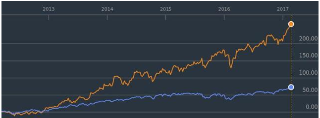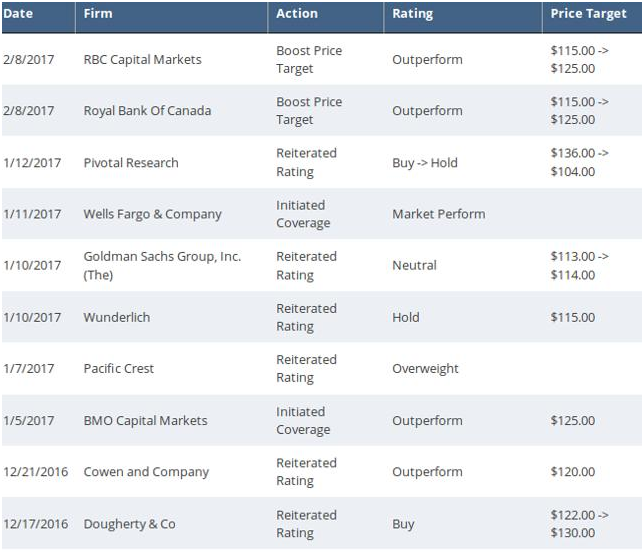 以下三图分别为Adobe与标普500(SPX)指数过去一个月、过去一年及过去五年的股价表现情况。每张图都表明Adobe的表现始终优于标普500。据彭博数据显示,在过去一个月中,Adobe股价上涨7.8%,标普500上涨4.42%,Adobe涨幅为标普500涨幅的1.77倍。2017年年初以来, Adobe与标普500涨幅分别为16.2%和5.65%,Adobe涨幅为标普500的2.87倍。过去一年中,Adobe与标普500涨幅分别为42.7%和24.21%,前者涨幅为后者的1.7倍。过去五年中,Adobe与标普500涨幅分别为258.07%和73.19%,前者涨幅为后者的3.53倍。Adobe的股价表现大放异彩,加拿大皇家银行和金融时报的分析师纷纷看好该股,认为其将在2017年延续过去五年的辉煌,继续上涨。分析师给出的最高目标价为150美元,较其当前股价高出20%。