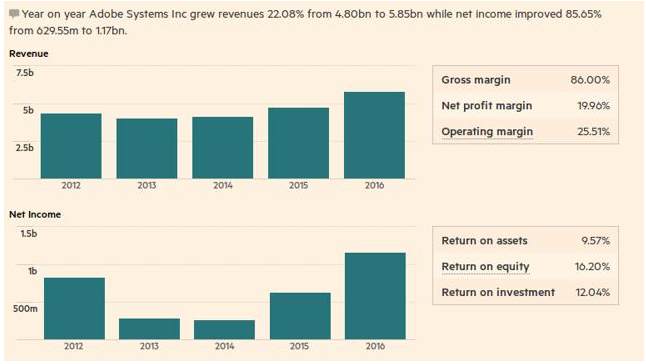 Adobe的当前股价表明它是一只价值型股票,公司股价一直以来的出色表现也反应了公司目前的发展状况相当不错。公司CEO Shantanu Narayen冒险行事,将Adobe的重心转向订阅模式,但所幸业绩甚佳。从上表数据可知,Adobe认为在传统软件开发、市场营销及统计分析等方面加大对云计算的投入将会使公司营收持续增加。截至2016年末,Adobe营收创下历史新高,达58.5亿美元,其中40亿美元来自订阅业务,这为公司发展打下坚实基础。同时也意味着公司季报表现也将令人满意,从而使Adobe股价更加稳定上涨。