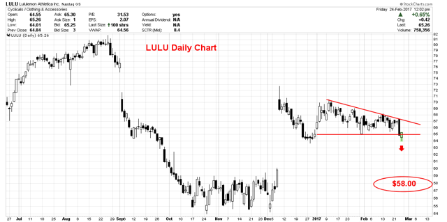 根据 ChartMasterPro的每日价格模型可以看出,露露柠檬的股价走向呈下降三角形,其股价将在收盘价接近65美元的价位之后开始走低。笔者认为未来3个月露露柠檬的股价将会跌至58美元。鉴于此,笔者以65美元的执行价买入了4月21日到期的看跌期权,这将会为这笔看跌交易提供近8倍的杆杆,止损点设置在68美元的价位。