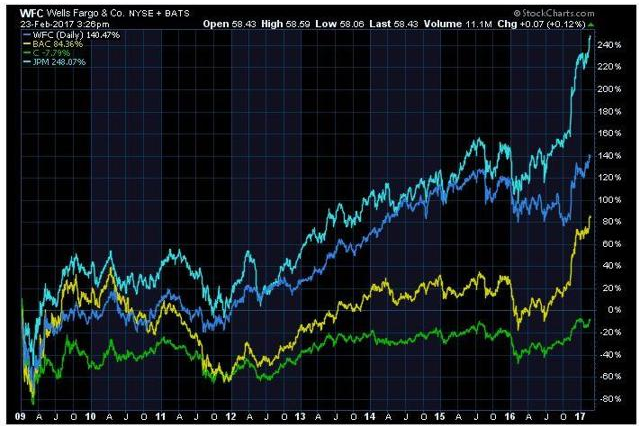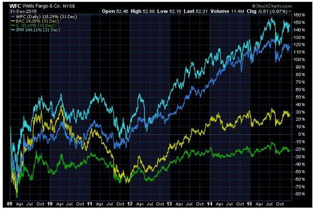 从下图可知,2009至2016年初期间富国银行与摩根大通(NYSE:JPM)的股价表现旗鼓相当,这两只股的表现都优于同行美国银行(NYSE:BAC)和花旗银行(NYSE:C)。