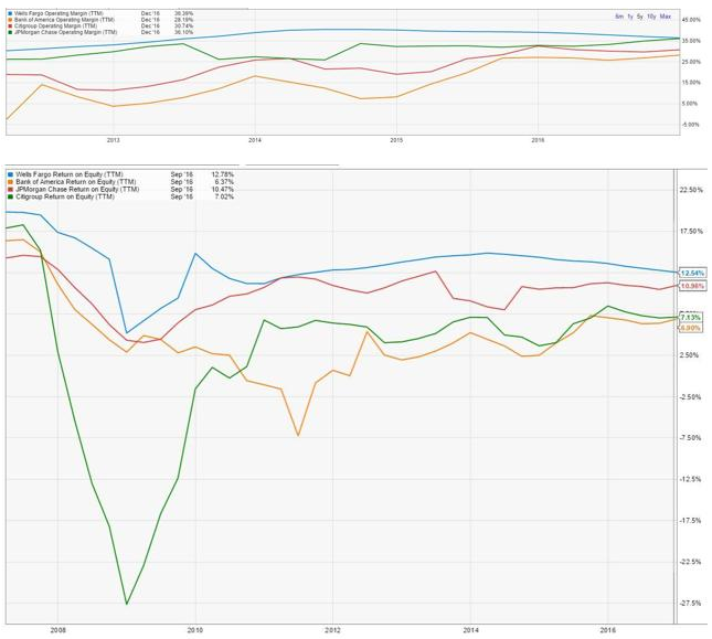 就营运利润和股本回报率而言,富国银行的表现始终优于其它同行。
