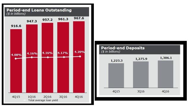 富国银行的存贷款金额均有所增加,这是至关重要的。要想衡量2016年的假账丑闻是否对富国银行造成重创,关键就在于未来几月中富国银行的存贷款能实现多少增长。截至目前,富国银行的存贷款额尚未出现任何下滑。