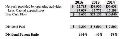 从上表可以看出,同去年相比,威瑞森的股息支付率变化最大。公司2016年全年的股息支付率为164%,远高于100%,笔者认为这并非什么好事。公司管理层在财报电话会议上称现金流严重缩水是因为受现金所得税开支及资产证券化等影响。不管怎么解释,这份业绩都让仅看中公司股息派发而入手的投资者大失所望,同时引发他们对公司未来的担忧。
