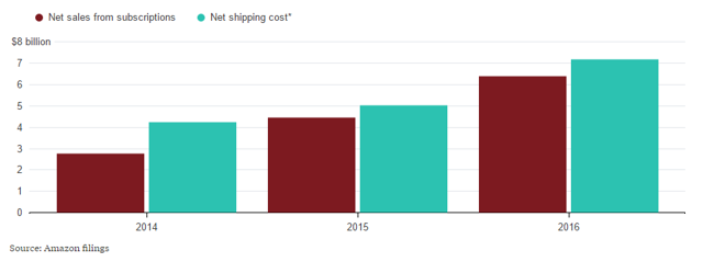 看起来物流成本是高的令人发指,但是随着亚马逊不断地扩充仓储网络和运输工具,其单件物流成本实际上是下降的。此外,亚马逊的会员订阅费用也跟上了物流成本的增长速度。