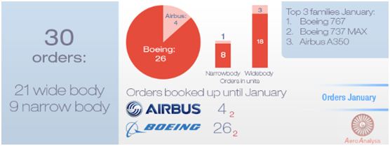 1月份订单总额上,波音订单共计37亿美元,而空客方面仅有5亿美元;且70%的订单为宽体机型。