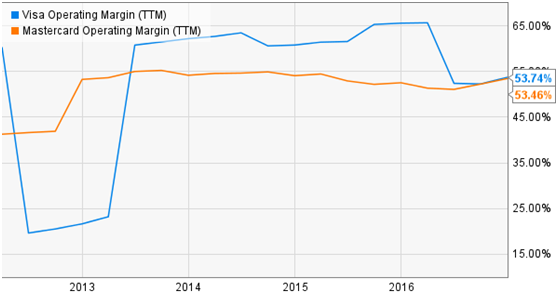 维萨和万事达都具有50%以上的毛利率,由于业务性质,公司的毛利率往往就决定了利润率,因此,公司的利润率也是维持在30%以上,接近40%。